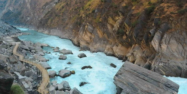 ជ្រលងដ៏ធំទូលាយដែលមានភ្នំ Jade Dragon Snow និងភ្នំ Haba Snow នៅជុំវិញ និងទន្លេ Jinsha ដែលហូរយ៉ាងខ្លាំង។