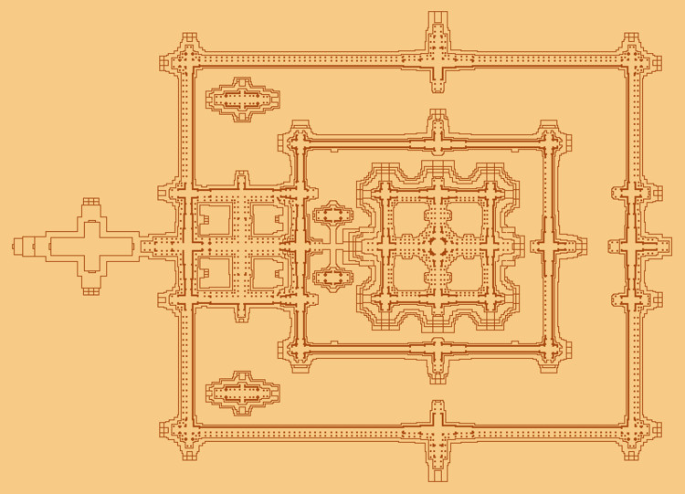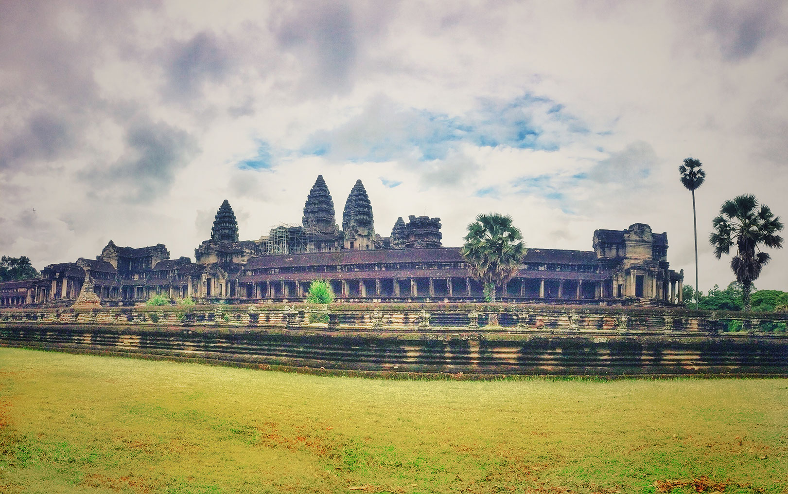 ប្រាសាទអង្គរ មានកម្ពស់ ៦៥ម៉ែត្រ មានក្រឡាផ្ទៃប្រហែល ២០០ហិចតា រាងចតុកោណ ដែលកំណត់ដោយកំពែងព័ទ្ធជុំវិញ និង គូទឹក ដែលមានទទឹង ២០០ម៉ែត្រ។ បរិវេណនៃកំពែង គឺមានប្រវែងប្រហែល ៥,៥គ.ម។ ផ្លូវចូលធ្វើអំពីថ្មភក់មានប្រវែងបណ្តោយ ២៥០ម៉ែត្រ និងទទឹង ១២ម៉ែត្រ។ ដោយសារតែទំហំដ៏ធំ និងស្ថាបត្យកម្មដ៏អស្ចារ្យនេះ មានមនុស្សមួយចំនួនគិតថា ប្រាសាទអង្គរវត្តមិនមែនជាស្នាដៃរបស់មនុស្សទេ គឺជាស្នាដៃរបស់អាទិទេព។នៅខាងមុខផ្លូវចូលមានតោថ្មធំៗ ឈរយាមនៅអមសងខាងផ្លូវ។ នៅខាងចុងនៃផ្លូវចូលនោះ មានគោបុរៈប្រាង្គបី ដែលមានកម្ពស់ខុសគ្នា ហើយប្រាង្គផ្នែកខាងលើត្រូវបានដួលរលំហើយ។ នៅគោបុរៈនោះ មានថែវដែលមានកំពូលជាវូត។ បន្ទាប់ពី គោបុរៈមកគឺមានផ្លូវមួយដែលមានប្រវែងបណ្តោយ ៣៥០ម៉ែត្រ និង ទទឹង ៩ម៉ែត្រ ធ្វើពីថ្មភក់ និង បង្កាន់ដៃនាគនៅអមសងខាង។